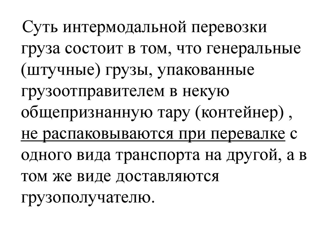 Суть интермодальной перевозкигруза состоит в том, что генеральные