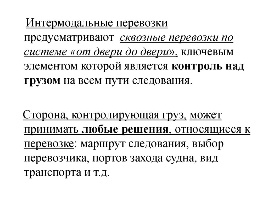 Интермодальные перевозкипредусматривают сквозные перевозки по
