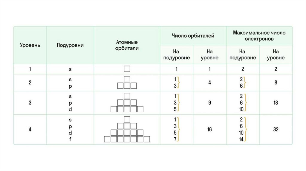 максимально возможно присутствие двух электронов, на pорбитали — шести, на d-орбитали — десяти, на f-орбитали —