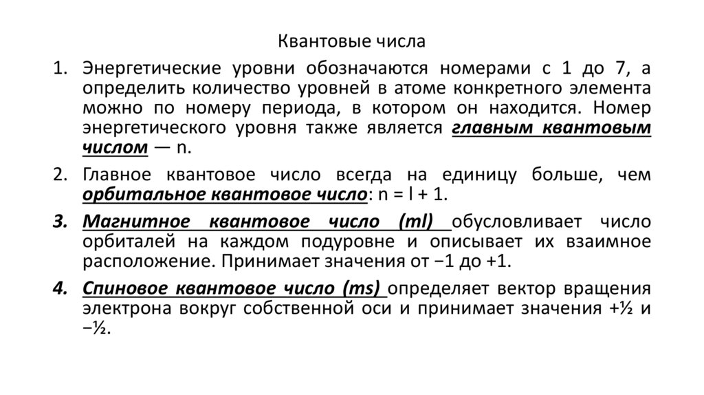 Квантовые числа1. Энергетические уровни обозначаются номерами с 1 до 7, а