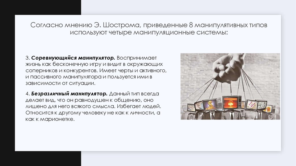 8. Согласно мнению Э. Шострома, приведенные 8 манипулятивных типов используют четыре манипуляционные системы: