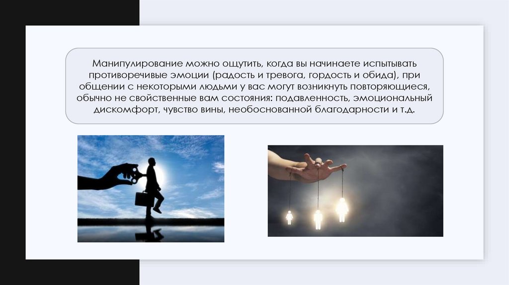 Манипулирование можно ощутить, когда вы начинаете испытыватьпротиворечивые эмоции (радость и тревога, гордость и обида), при