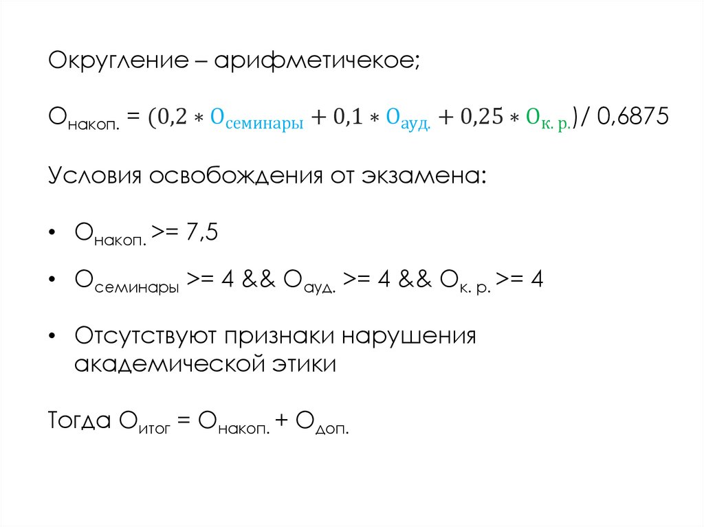 Округление – арифметичекое;Онакоп. = (0,2 ∗ Осеминары + 0,1 ∗ Оауд. + 0,25 ∗ Ок. р. )/ 0,6875