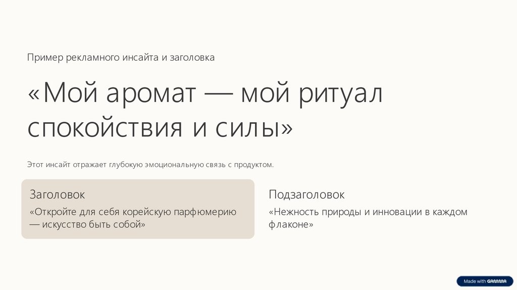 Пример рекламного инсайта и заголовка«Мой аромат — мой ритуал