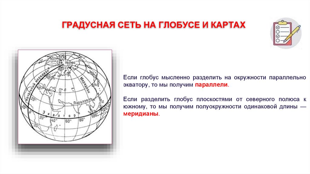 ГРАДУСНАЯ СЕТЬ НА ГЛОБУСЕ И КАРТАХЕсли глобус мысленно разделить на окружности параллельно