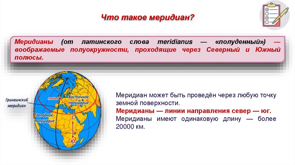 Что такое меридиан?Меридианы (от латинского слова meridianus — «полуденный») —