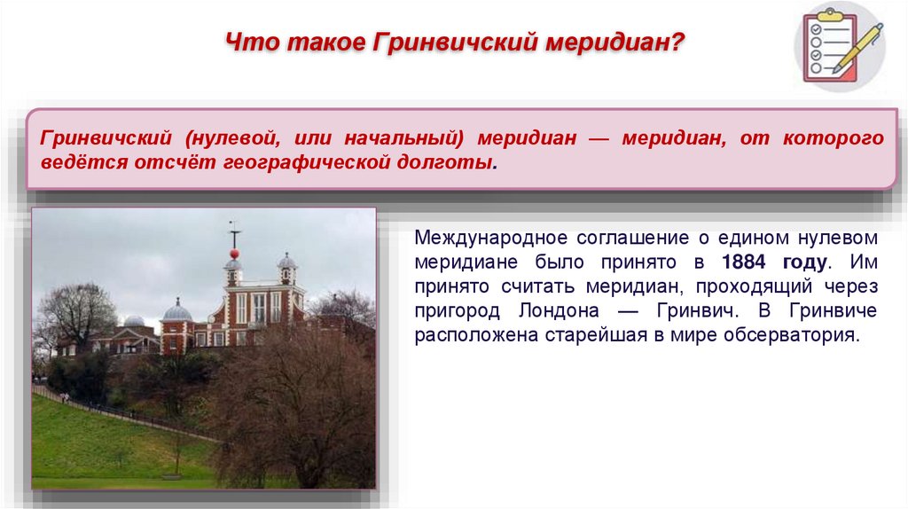 Что такое Гринвичский меридиан?Гринвичский (нулевой, или начальный) меридиан — меридиан, от которого