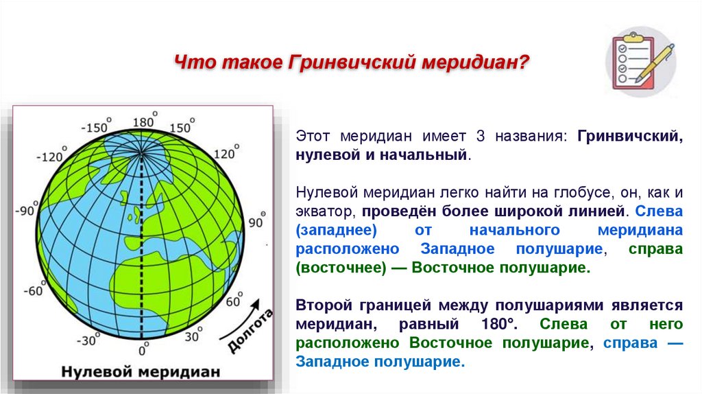 Нулевой меридиан легко найти на глобусе, он, как и