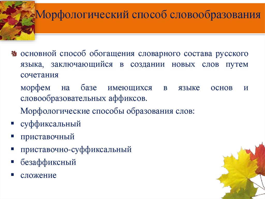 Морфологический способ словообразованияосновной способ обогащения словарного состава русского