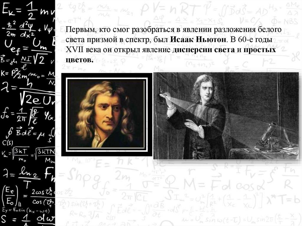 Первым, кто смог разобраться в явлении разложения белогосвета призмой в спектр, был Исаак Ньютон. В 60-е годы