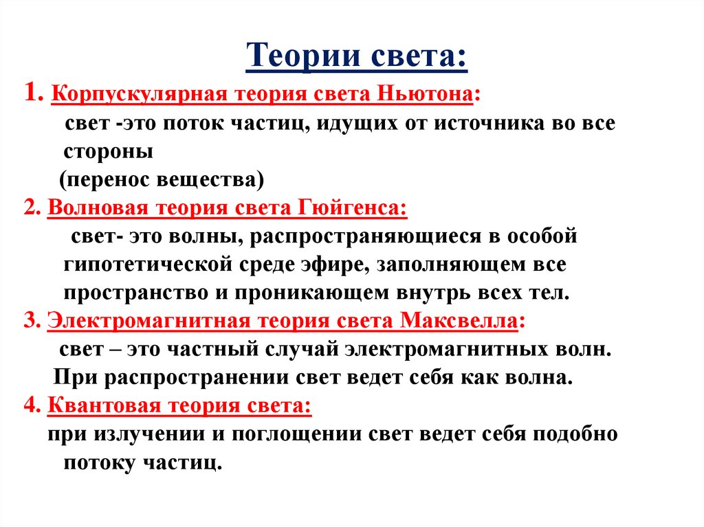 Теории света:1. Корпускулярная теория света Ньютона: