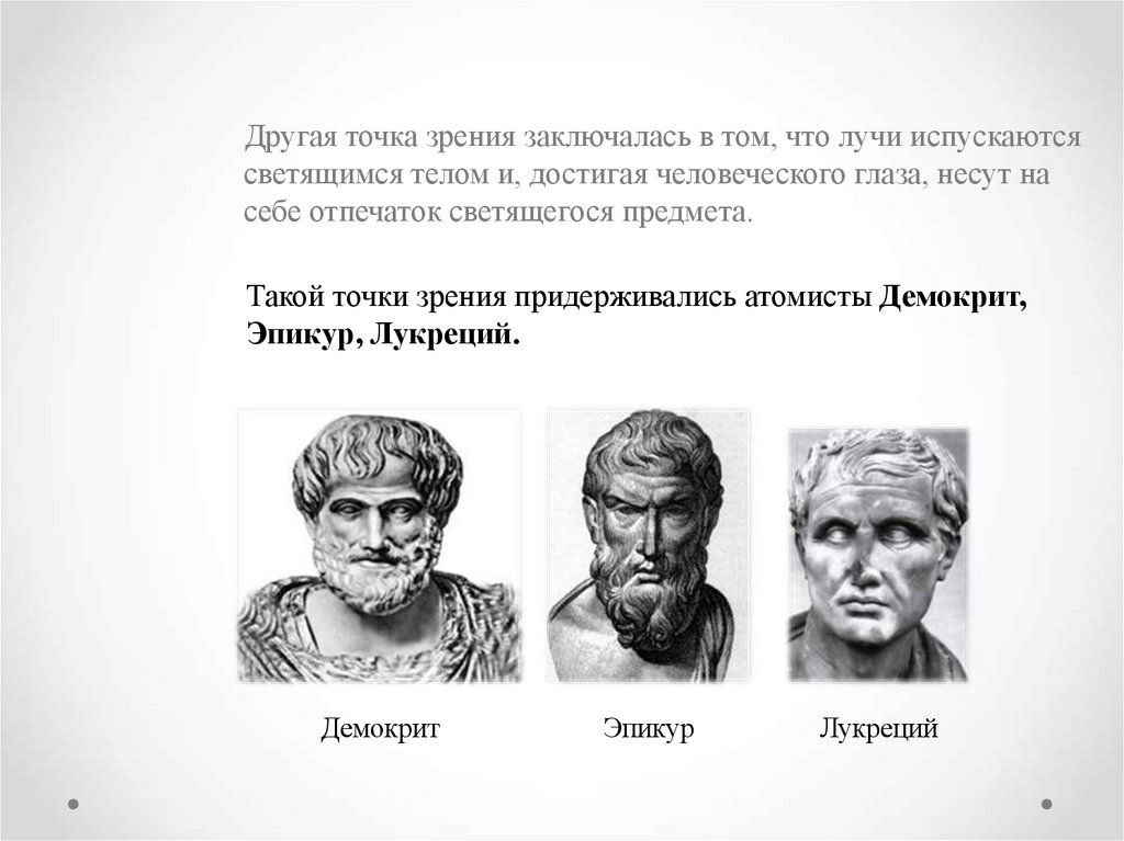 Другая точка зрения заключалась в том, что лучи испускаютсясветящимся телом и, достигая человеческого глаза, несут на
