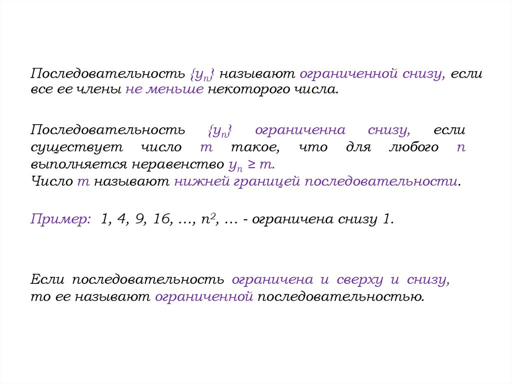 Последовательность {уn} называют ограниченной снизу, есливсе ее члены не меньше некоторого числа.