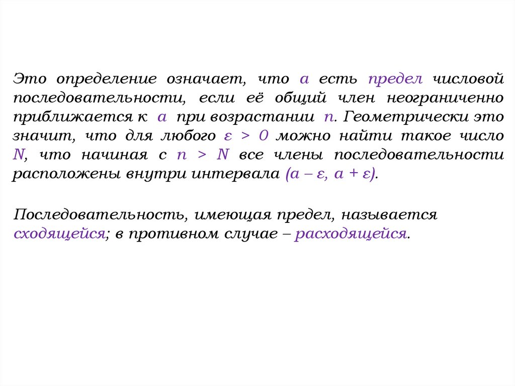Это определение означает, что a есть предел числовойпоследовательности, если её общий член неограниченно