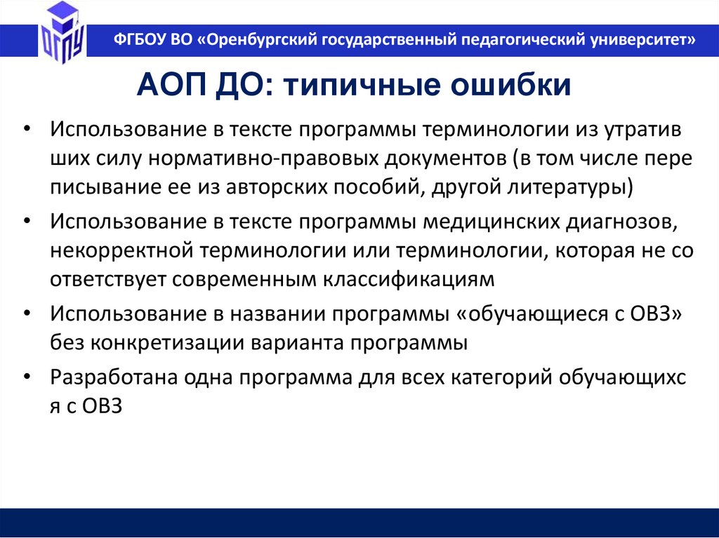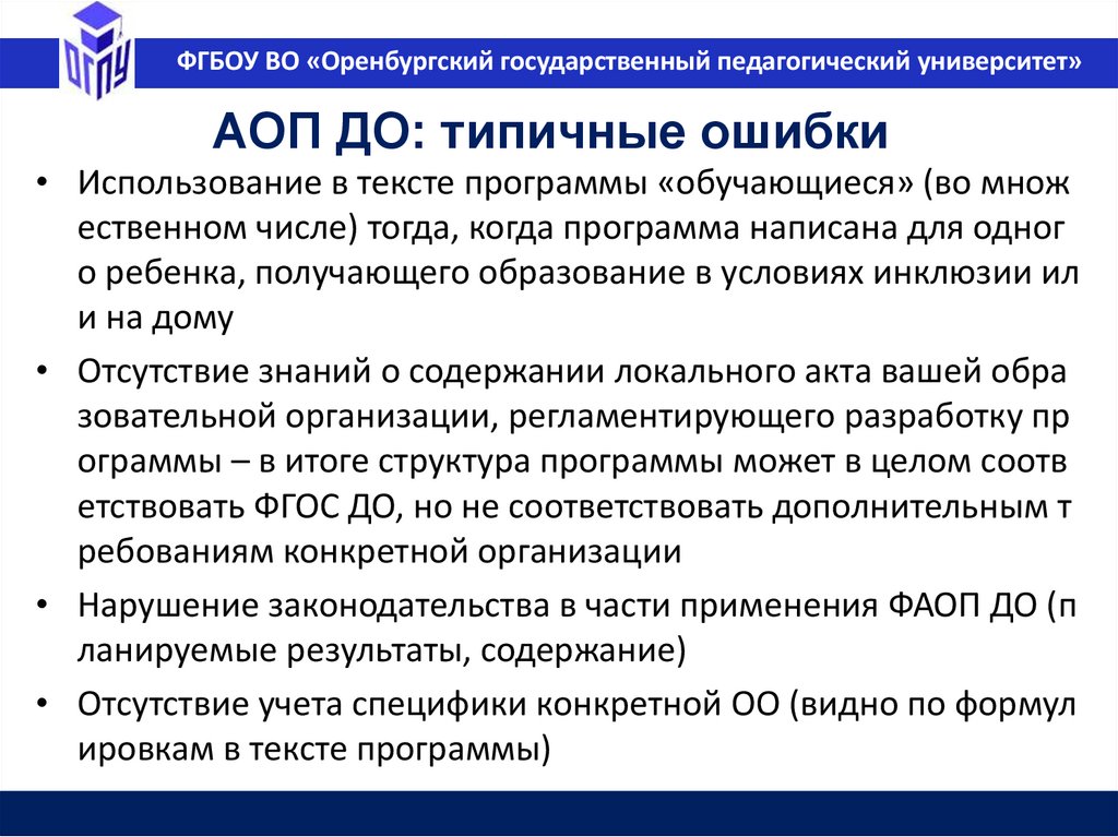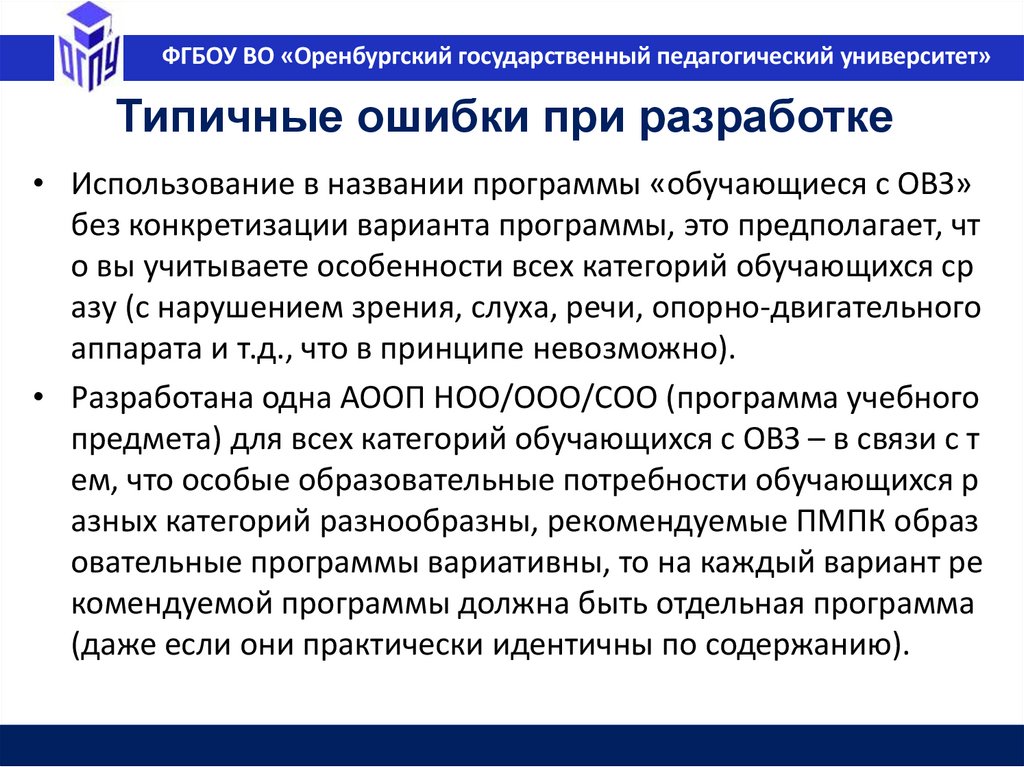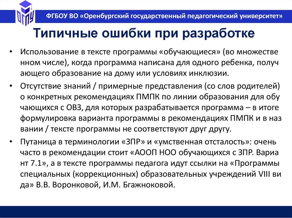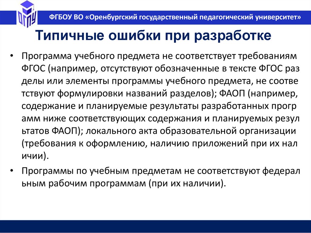ФГБОУ ВО «Оренбургский государственный педагогический университет»Типичные ошибки при разработке