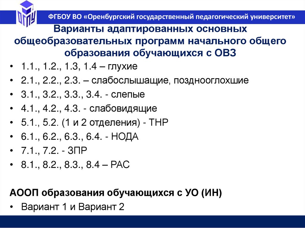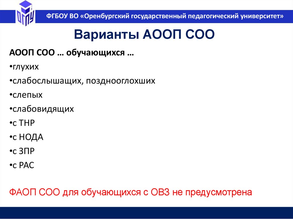 ФГБОУ ВО «Оренбургский государственный педагогический университет»Варианты АООП СОО