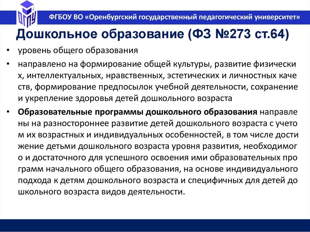 ФГБОУ ВО «Оренбургский государственный педагогический университет»Дошкольное образование (ФЗ №273 ст.64)