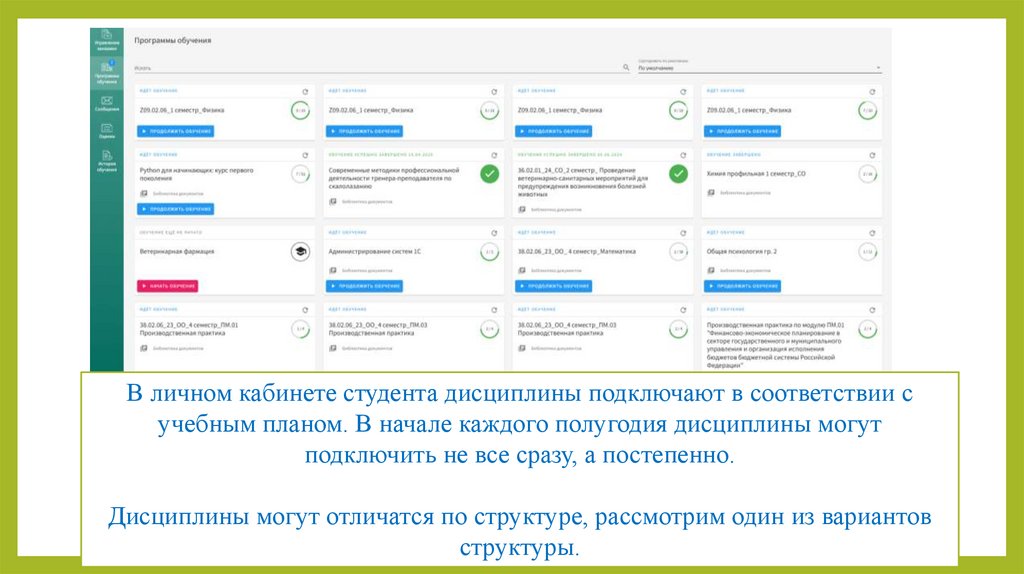 В личном кабинете студента дисциплины подключают в соответствии сучебным планом. В начале каждого полугодия дисциплины могут