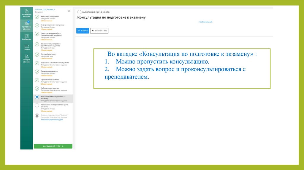 Во вкладке «Консультация по подготовке к экзамену» :1. Можно пропустить консультацию.