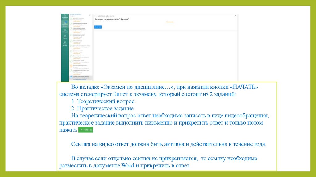 Во вкладке «Экзамен по дисциплине…», при нажатии кнопки «НАЧАТЬ»система сгенерирует Билет к экзамену, который состоит из 2 заданий: