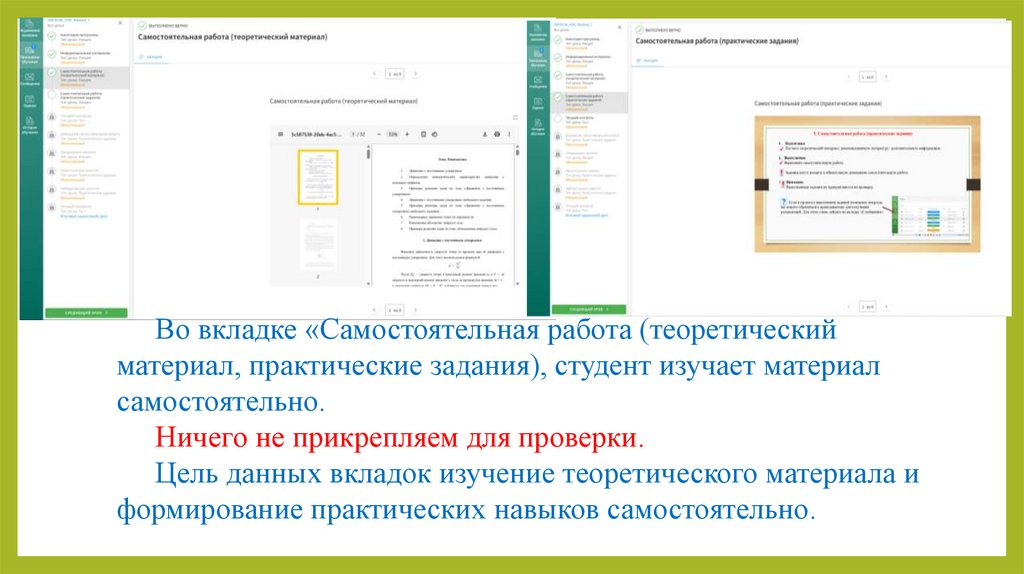 Во вкладке «Самостоятельная работа (теоретическийматериал, практические задания), студент изучает материал