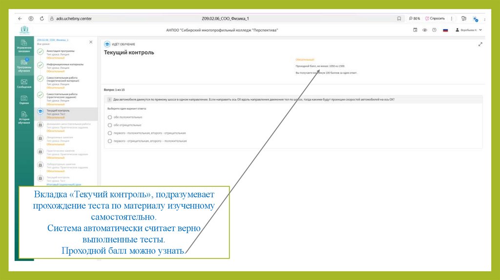Вкладка «Текучий контроль», подразумеваетпрохождение теста по материалу изученному
