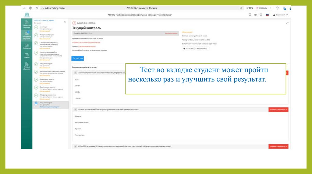 Тест во вкладке студент может пройтинесколько раз и улучшить свой результат.