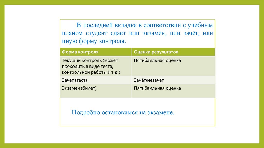 В последней вкладке в соответствии с учебнымпланом студент сдаёт или экзамен, или зачёт, или
