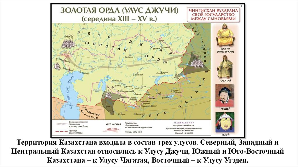 Территория Казахстана входила в состав трех улусов. Северный, Западный иЦентральный Казахстан относились к Улусу Джучи, Южный и Юго-Восточный