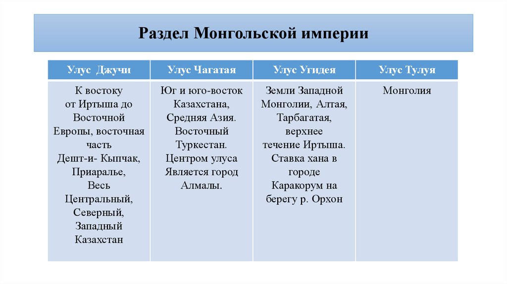 Казахстана – к Улусу Чагатая, Восточный – к Улусу Угэдея.