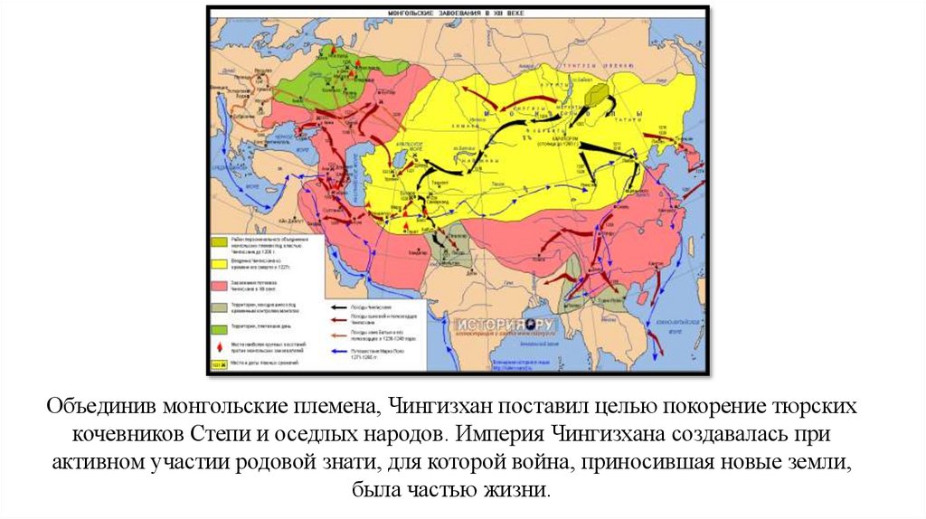 Объединив монгольские племена, Чингизхан поставил целью покорение тюрскихкочевников Степи и оседлых народов. Империя Чингизхана создавалась при