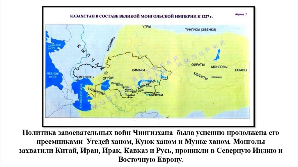Политика завоевательных войн Чингизхана была успешно продолжена егопреемниками Угедей ханом, Куюк ханом и Мунке ханом. Монголы