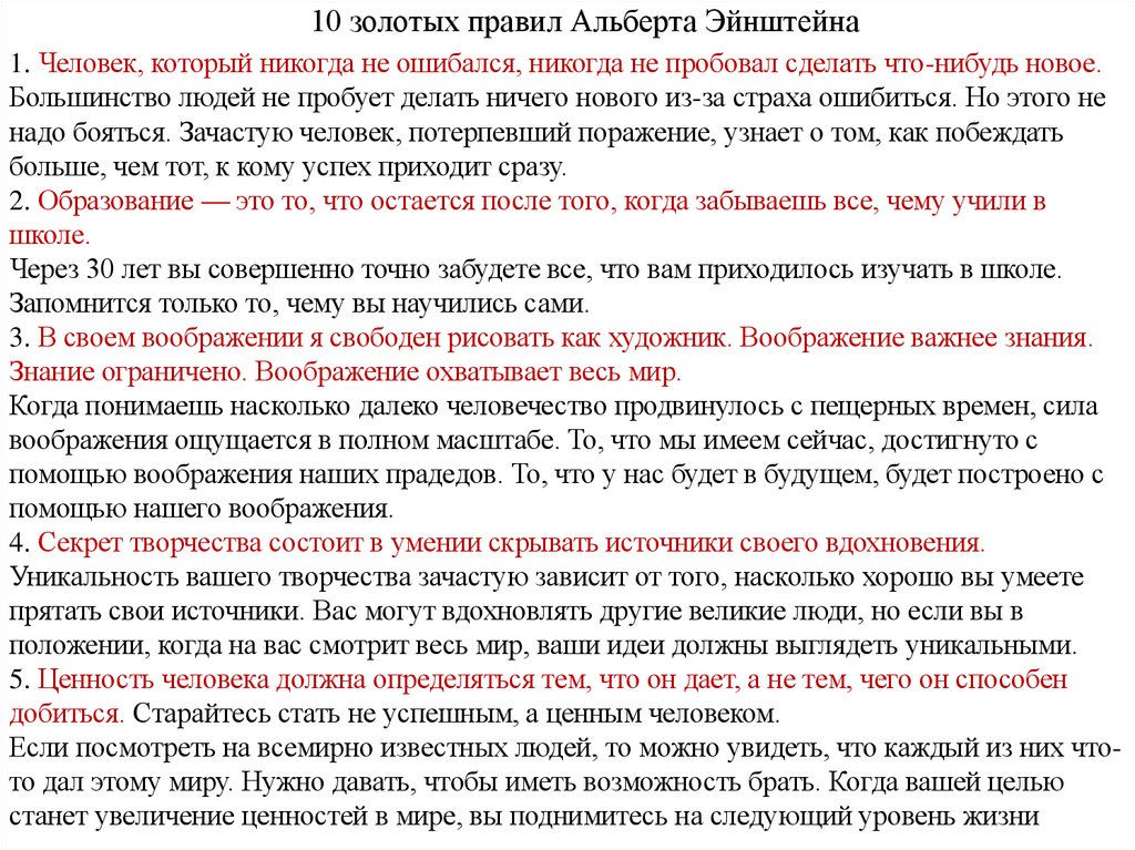 10 золотых правил Альберта Эйнштейна1. Человек, который никогда не ошибался, никогда не пробовал сделать что-нибудь новое.