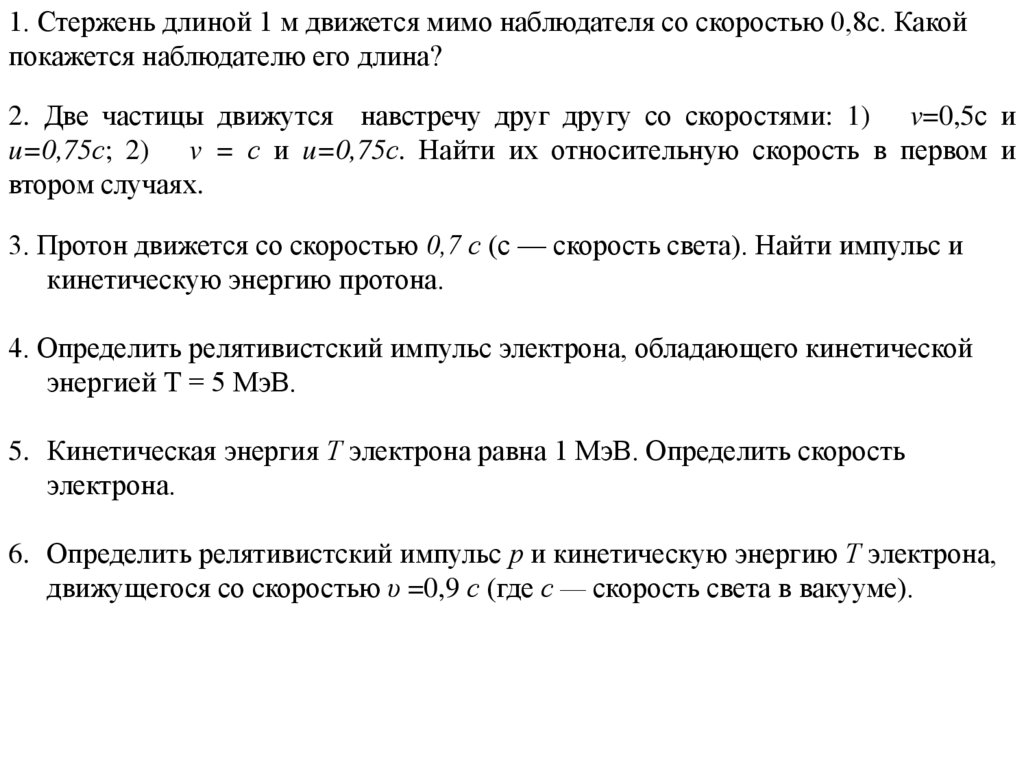 1. Стержень длиной 1 м движется мимо наблюдателя со скоростью 0,8с. Какойпокажется наблюдателю его длина?