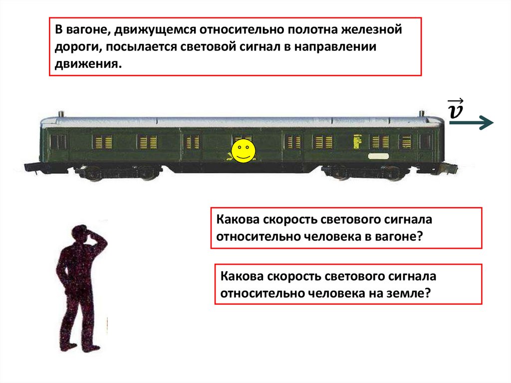 В вагоне, движущемся относительно полотна железнойдороги, посылается световой сигнал в направлении