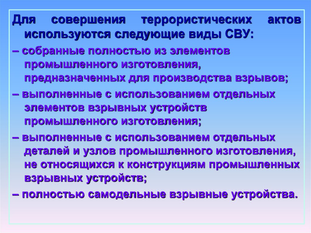 Для совершения террористическихиспользуются следующие виды СВУ: