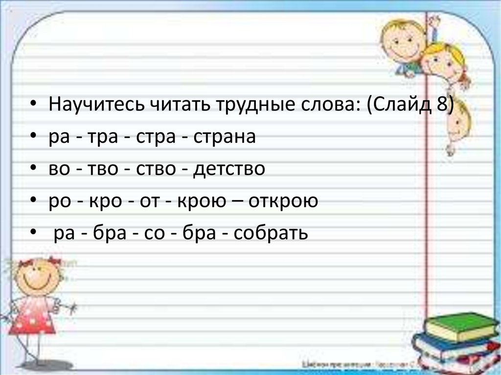 • Научитесь читать трудные слова: (Слайд 8)• ра - тра - стра - страна