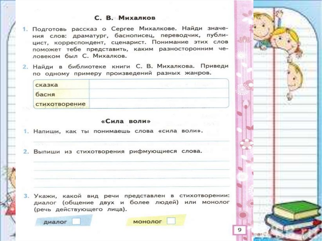 С. Михалков. "Сила воли"15. Выразительное чтение стихотворения детьми. 4. Работа по вопросам учебника, с. 34.