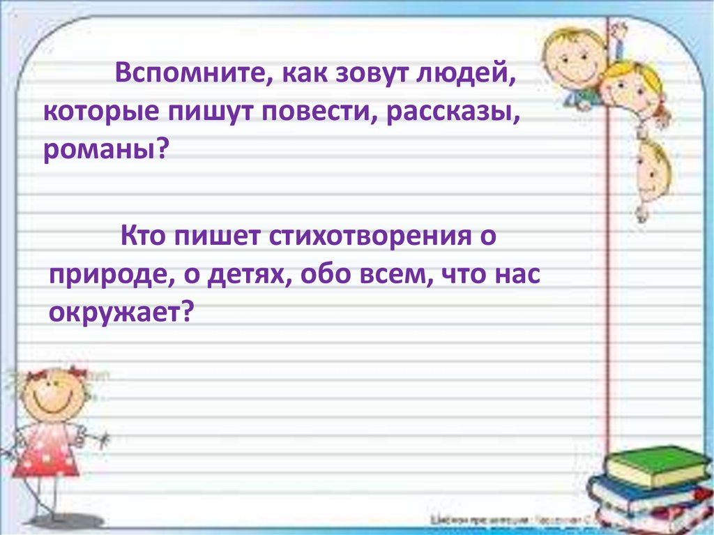 Вспомните, как зовут людей,которые пишут повести, рассказы,