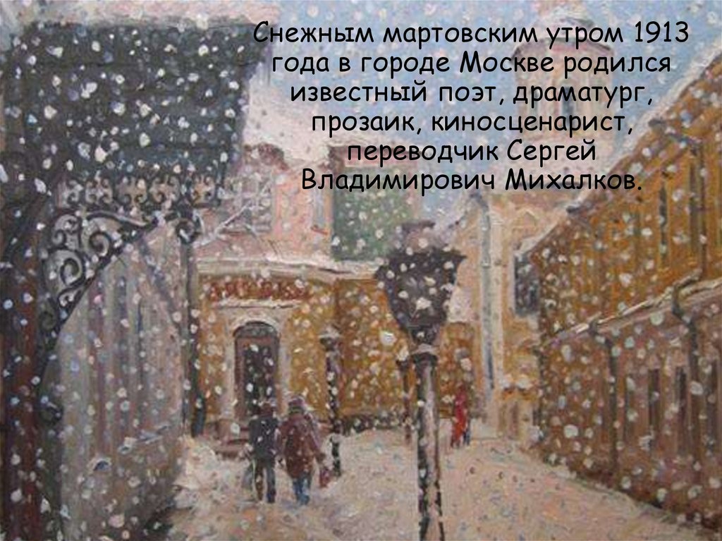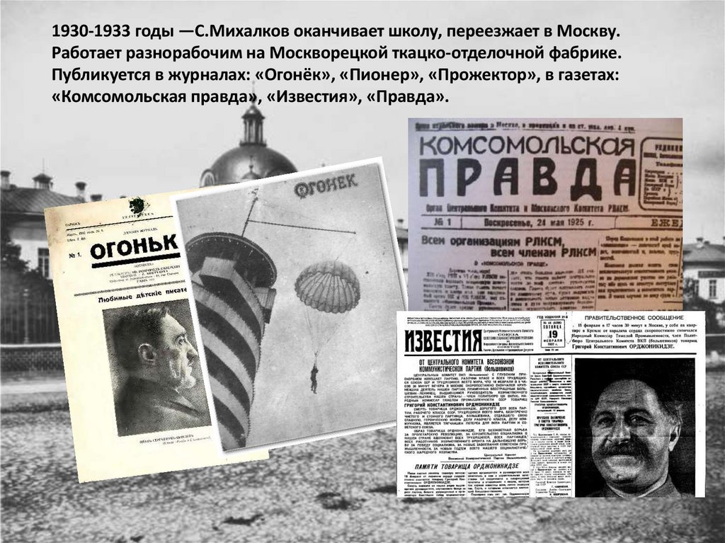 1930-1933 годы —С.Михалков оканчивает школу, переезжает в Москву.Работает разнорабочим на Москворецкой ткацко-отделочной фабрике.