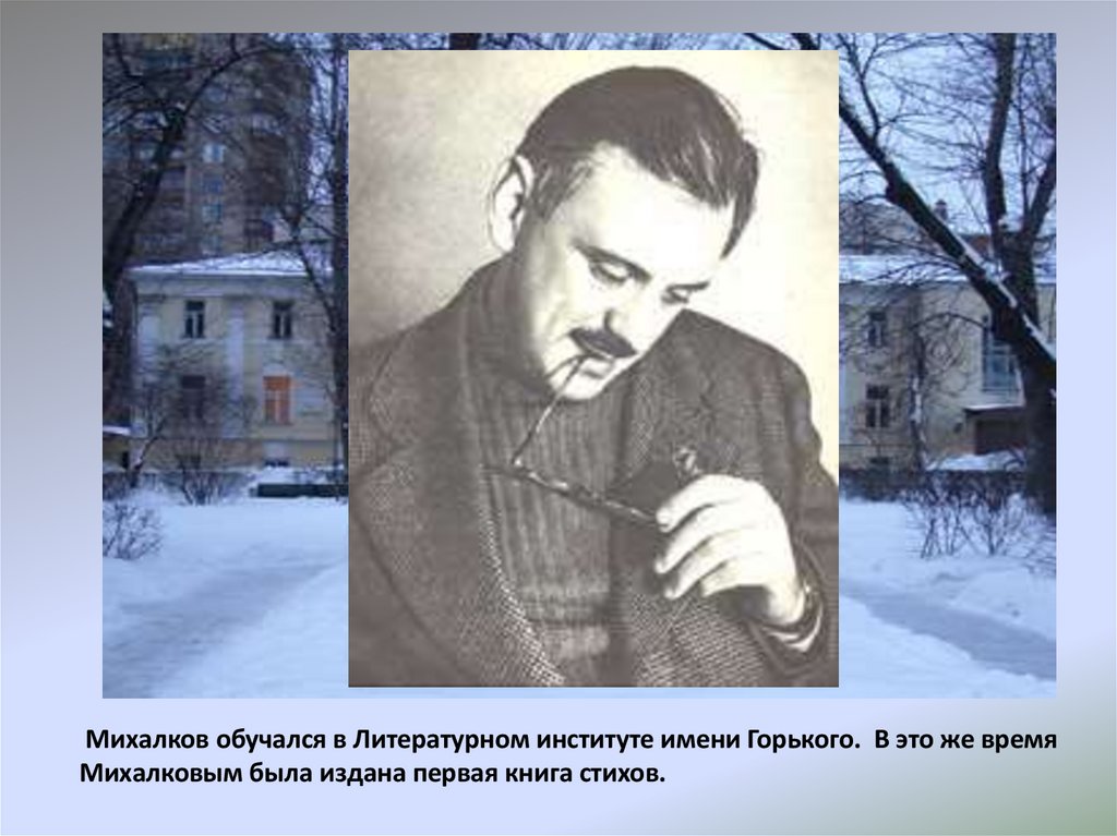 Михалков обучался в Литературном институте имени Горького. В это же времяМихалковым была издана первая книга стихов.