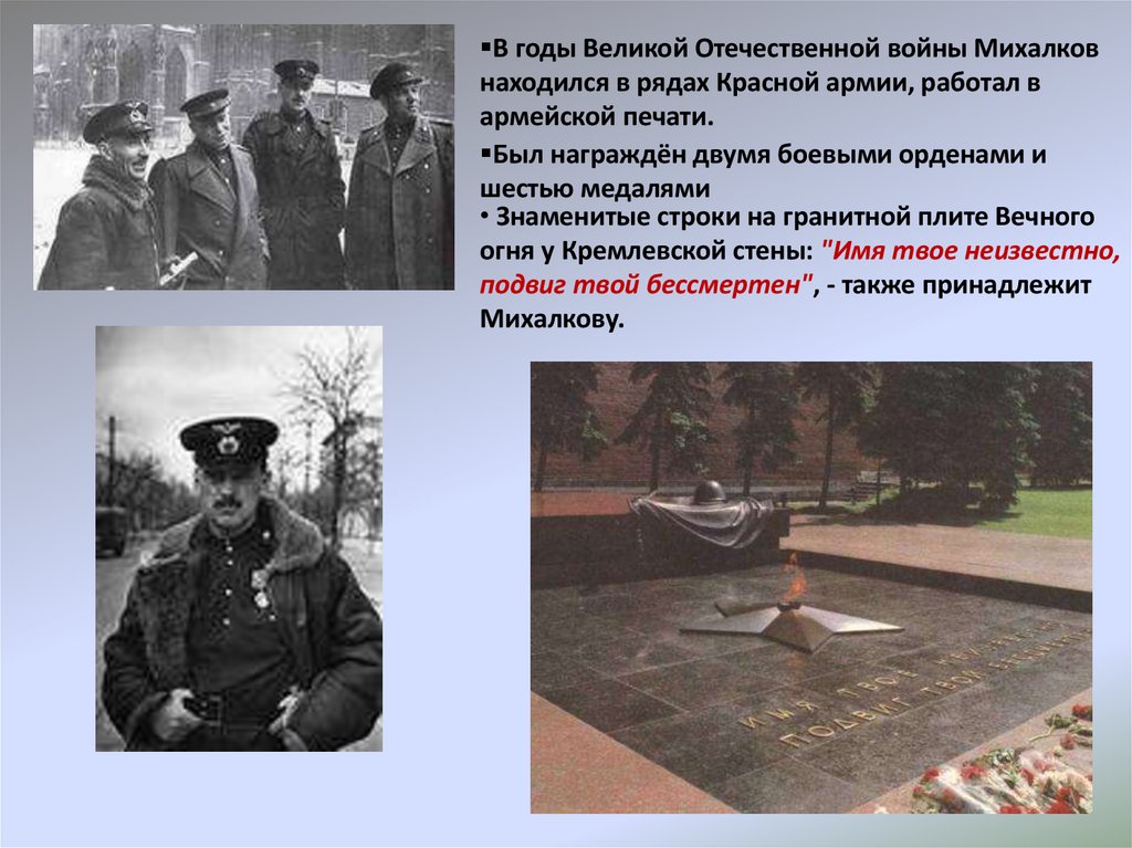 В годы Великой Отечественной войны Михалковнаходился в рядах Красной армии, работал в