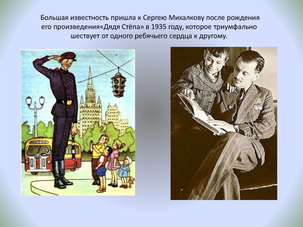 Большая известность пришла к Сергею Михалкову после рожденияего произведения«Дядя Стёпа» в 1935 году, которое триумфально