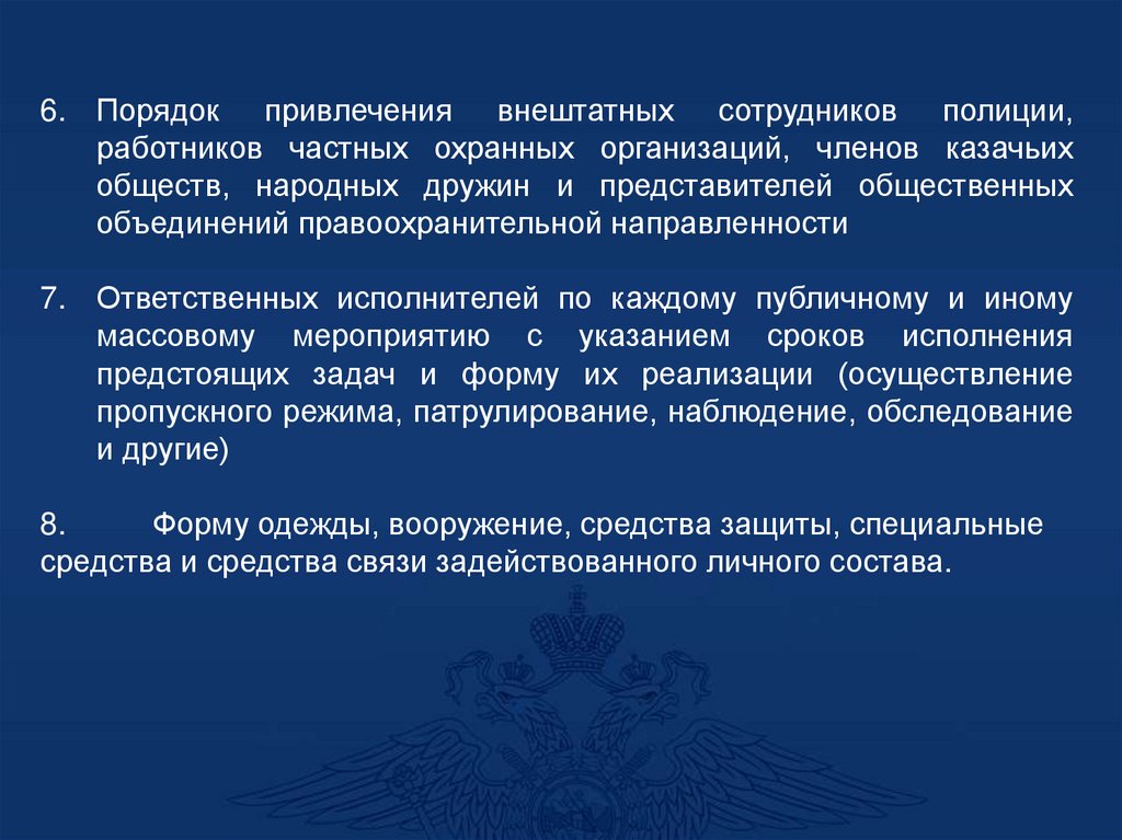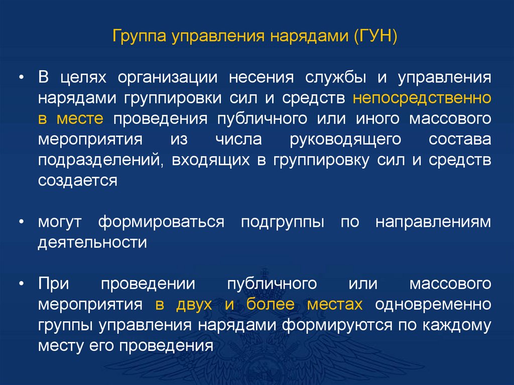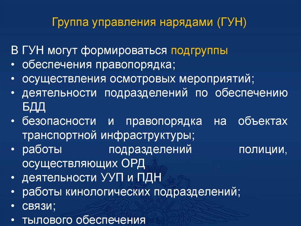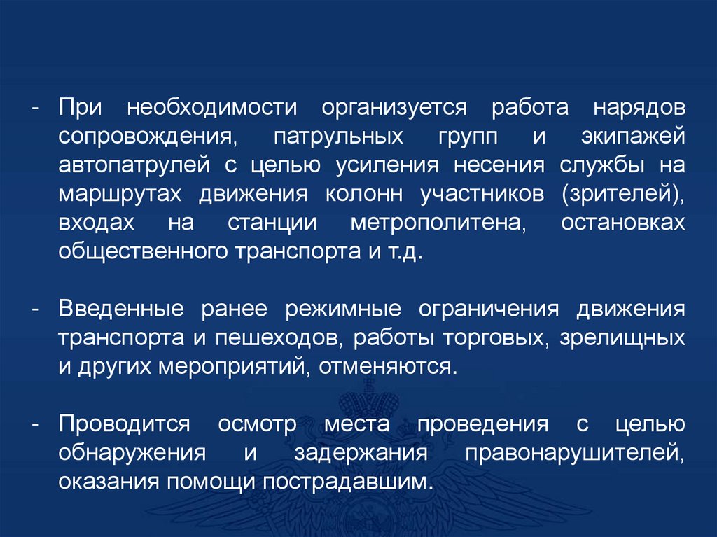 - При необходимости организуется работа нарядовсопровождения, патрульных групп и экипажей