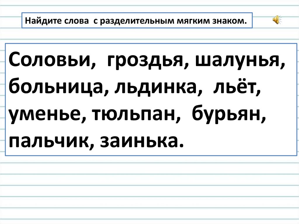 Найдите слова с разделительным мягким знаком.Соловьи, гроздья, шалунья,