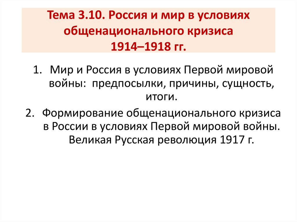 1. Тема 3.10. Россия и мир в условиях общенационального кризиса 1914–1918 гг.