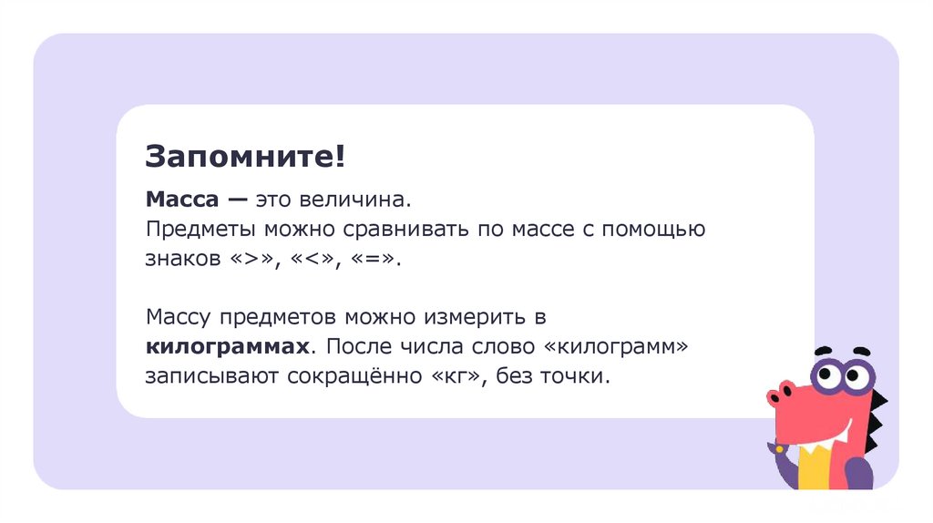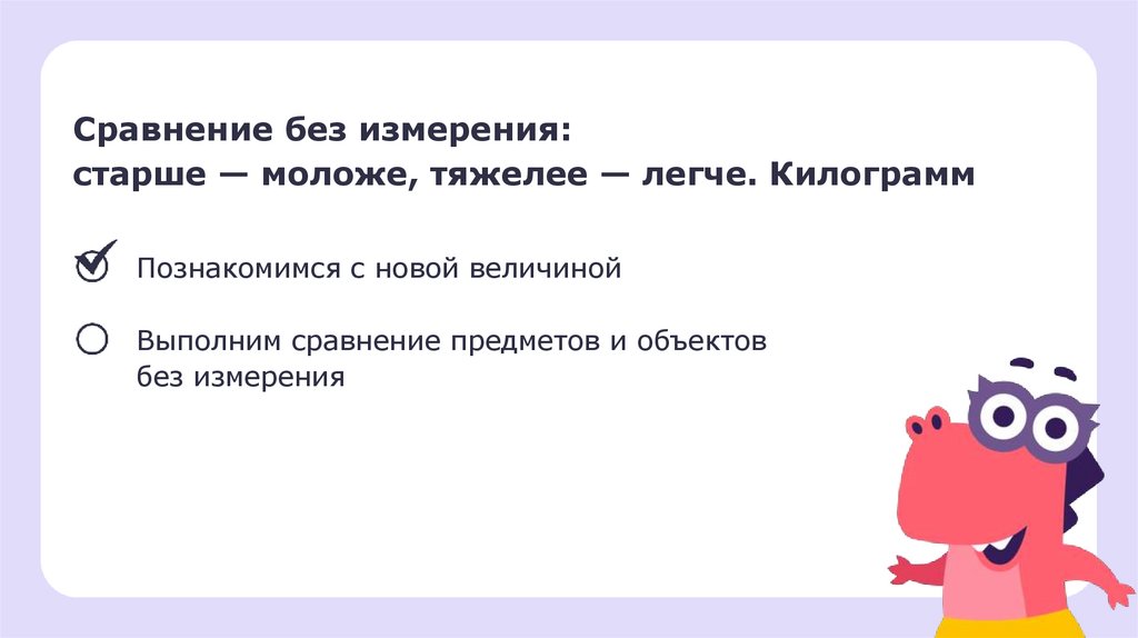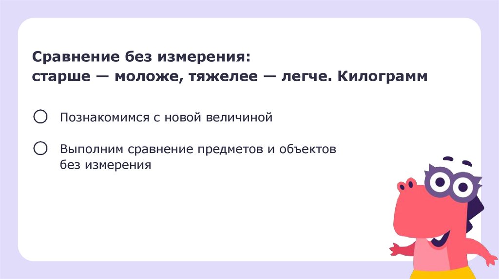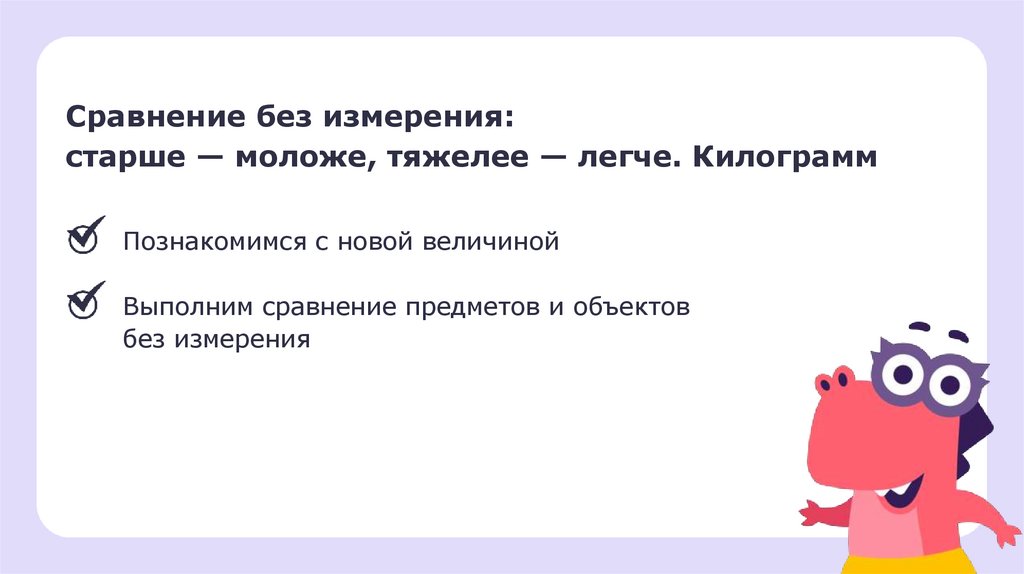 Сравнение без измерения:старше — моложе, тяжелее — легче. Килограмм