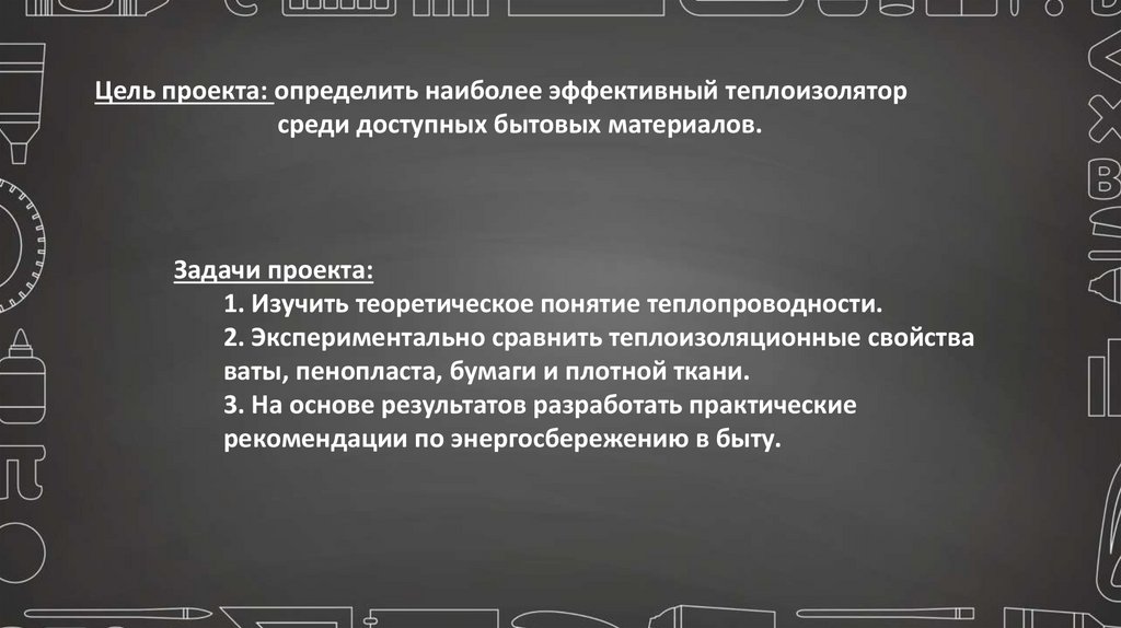 Цель проекта: определить наиболее эффективный теплоизоляторсреди доступных бытовых материалов.