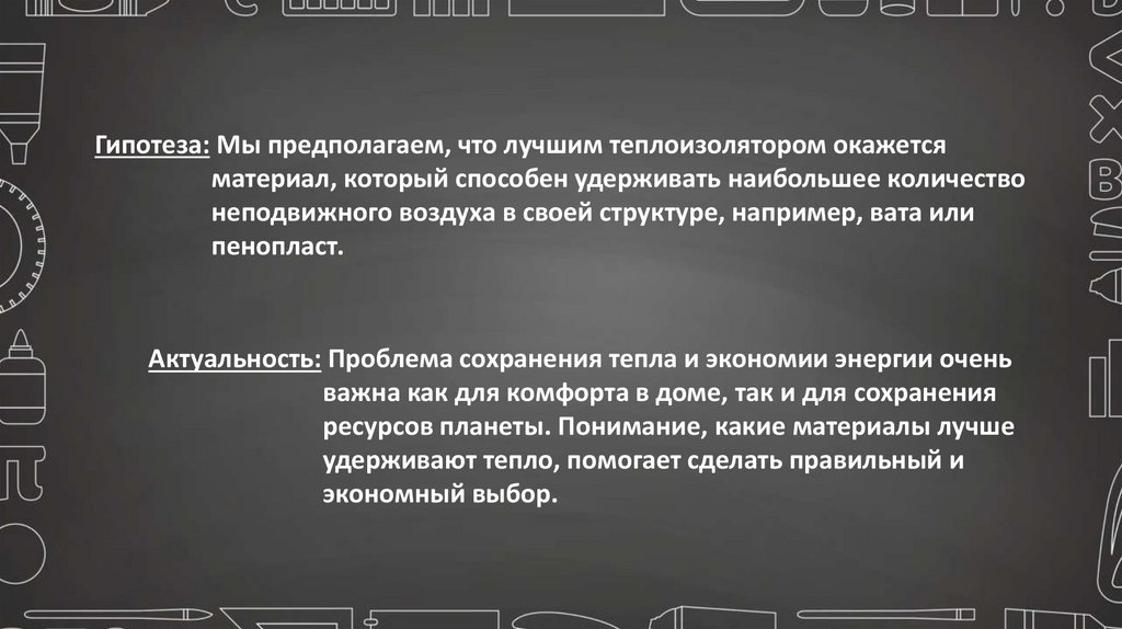 Гипотеза: Мы предполагаем, что лучшим теплоизолятором окажетсяматериал, который способен удерживать наибольшее количество