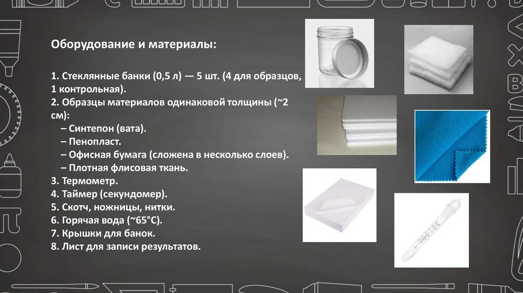Оборудование и материалы:1. Стеклянные банки (0,5 л) — 5 шт. (4 для образцов,